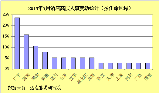 2014年7月,总共有38位高管被任命,环比下降3%,同比下降27%。本月,区域上,广东高管任命最频繁;职位上,总经理职位任命最多。
