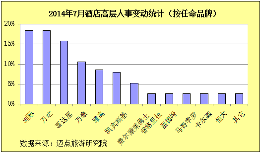迈点旅游研究院的数据显示,本月洲际和万达任命的高管数并列第一,各任命了7位高管,均占人事任命总数的约19%。其次是喜达屋,任命了5位高管,占比约为14%。此外,雅高、凯宾斯基也各有3位高管被任命,占比均为9%;费尔蒙莱佛士任命了2位,占比为5%。本月还有一些其他品牌有高管任命,例如香格里拉、温德姆、马哥孛罗、卡尔森和恒大等。具体如图3所示。