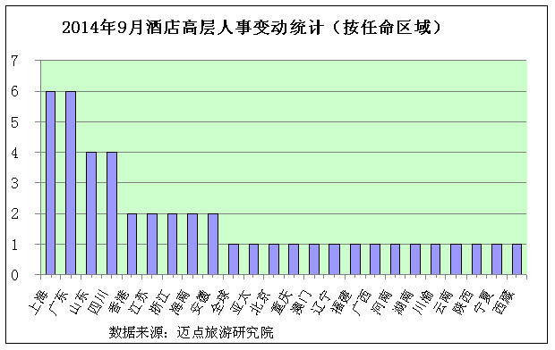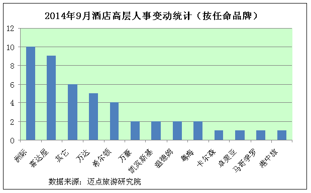 从任命高管所属酒店品牌来看,9月高管任命表现最活跃的是洲际,总共任命了10位高管,占全部星级酒店人事任命数的21.74%。这不仅与其在华管理的巨量酒店数息息相关,截至2013年底,洲际酒店集团在大中华地区开业酒店总数达208家,广泛分布于80多个一、二、三及四线城市;还与其在华扩张勃勃野心分不开——其计划自2014年起的未来三年,在华再开100家新店,并将在10年内把中国提升为与美国本土利润并重的两大市场。快速的数量扩张,加上对中国市场利润的孜孜以求,决定了洲际对高素质酒店人才的强烈渴求。因此,洲际高管任命就显得较为活跃。