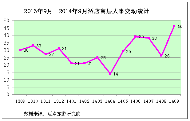 (迈点网 熊树安)2014年9月,进入迈点网“中国酒店行业监测系统平台”的5982家星级酒店企业中,总共有46位高管被任命,较上月增加20位,环比大幅增长76.92%;较去年同期增加16位,同比增长53.33%,增幅明显。这也继6月后,酒店高管任命数再次创下2014年以来的新高。
