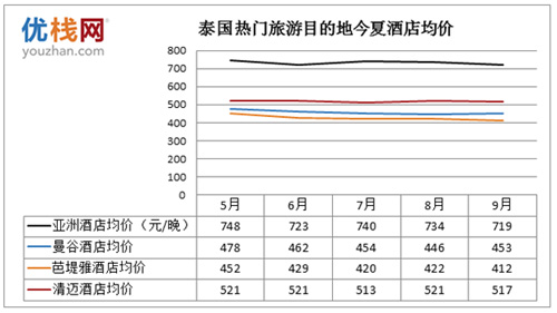 城市酒店价格指数tHPI数据显示,泰国热门旅游目的地今夏每晚酒店标间均价都在400至500元左右,大幅度低于整体亚洲酒店的消费水平。