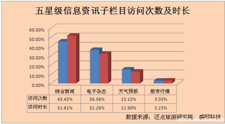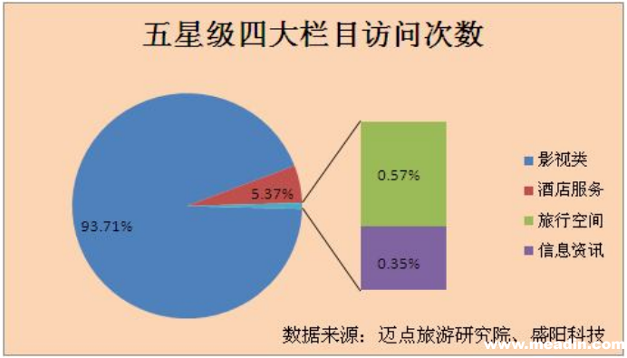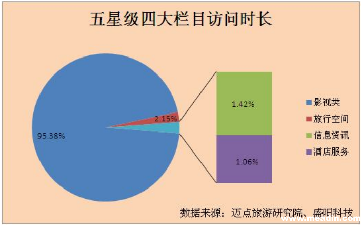 从四大栏目的访问时长来看,依次是影视类、旅行空间、信息资讯和酒店服务,占比依次是95.38%、2.15%、1.42%和1.06%。