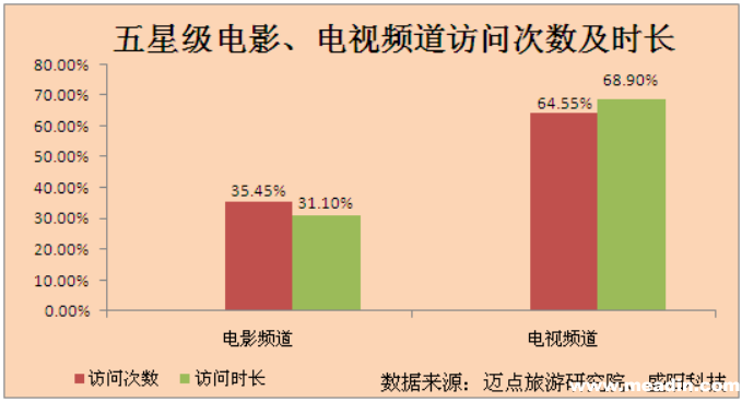 在影视类栏目中,统计显示电视频道的访问次数和访问时长都高于电影,这表明成都五星级智慧酒店用户更加偏好电视频道,这主要是由于电视频道实时性强,提供的内容丰富,给用户提供了较大的选择空间,因此用户自然更倾向于收看电视频道。