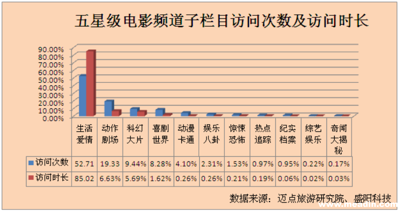 从访问次数上来看,五星级酒店用户最青睐的电影是生活爱情类,该类影片占比高达52.71%。其次是动作剧场片、科幻片和喜剧片,占比分别是19.33%、9.44%、8.28%。