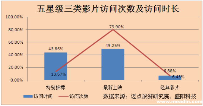 在智慧电视系统中还可发现,对标注为最新上映、特别推荐及经典类的影片,五星级酒店用户表现出了不同的偏好。其中最新上映的影片的访问次数数和访问时长都位居第一,特别推荐的影片则都位居第二,经典影片的访问次数和访问时长均排名第三,占比都比较低。这说明用户对新上映电影的好奇心较重,迫切希望进行观看。对于特别推荐电影,用户也表现出了很高的兴趣,该类电影访问次数占比高达43.86%,仅微落后于最新上映影片的49.25%,但访问时长占比相对较低,跟最新上映影片形成了鲜明的对比,其中部分原因是特别推荐的影片跟用户的需求有较大的落差,导致了特别推荐类影片高访问次数和低访问时长的状况。经典影片基于其内容相对比较陈旧,因此访问次数和访问时长都不高。