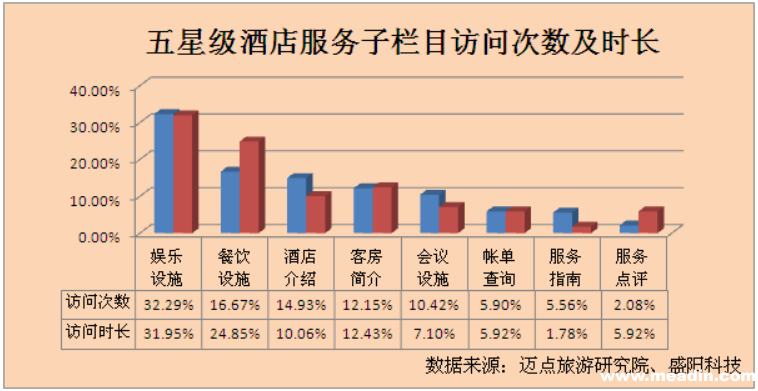 用户在酒店一项重要活动是进行娱乐休闲,这就导致用户对酒店所具备娱乐设施的极大关注,而这直接导致酒店服务在酒店中的高访问次数及访问时长。