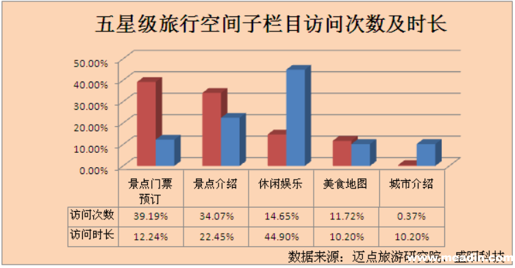 旅行空间栏目中,访问次数占比从高到低依次是景点门票预订、景点介绍、休闲娱乐,访问时长占比从高到低则依次是休闲娱乐、景点介绍和景点门票预订。