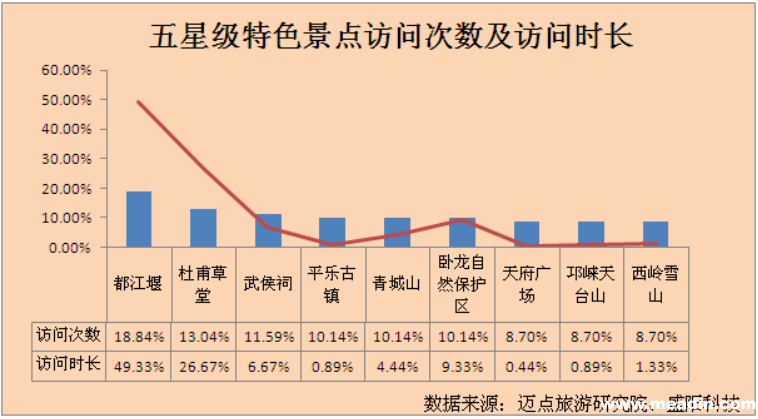 在特色景点访问中,数据显示,都江堰的用户访问次数和访问时长都高居第一,杜甫草堂则都位居第二,访问次数排名第三的景点是武侯祠,访问时长第三的则是卧龙自然保护区。