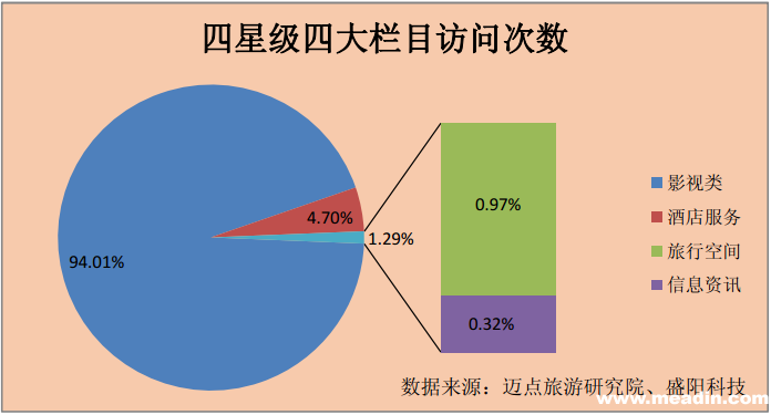 从访问时间上来看,影视类的时长占比最高,达95.99%,酒店服务类以3.15%的占比位居第二,旅行空间和信息资讯以0.66%和0.20%分别位居三、四位。