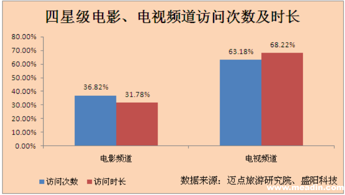 从影视类栏目来看,同五星级用户一样,四星级用户也都偏好电视频道栏目。统计显示,电视频道的访问次数和访问时长都高于电影频道,这跟电视频道丰富多彩的节目有很大关系。
