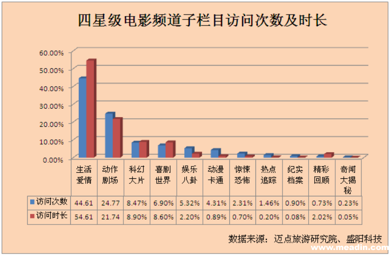 综合来看,四星酒店用户表现出了对生活爱情片的浓厚兴趣,无论是从访问时长还是访问次数上来看,生活爱情片在两者收看的影片类型中都高居第一。生活爱情片特点鲜明,贴近生活,有些爱情片又能给用户带来憧憬,因此占比比较高。同五星酒店用户对影片类型的偏好比较类似,四星用户也普遍对动作片、科幻片、喜剧片比较感兴趣。略有不同的是,四星用户对动漫片的偏好不及五星用户。