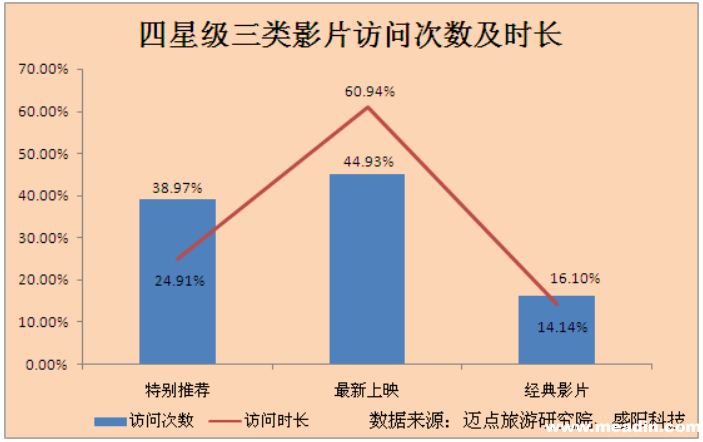 同时,数据显示,四星用户比较偏好最新上映的影片,其次是特别推荐和经典类影片,这跟五星用户也是一致的。应该说,新上映影片给人以无尽的想象,使人非常期待。这直接导致该类影片的高访问次数和访问时长。略有不同的是,四星用户最新上映影片及特别推荐类影片的访问次数占比略低于五星酒店用户,而经典影片的访问次数和访问时长占比都高于五星酒店。