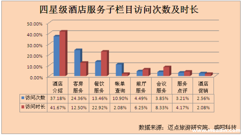 酒店服务栏目中,从访问次数上来看,酒店介绍、客房服务、餐饮服务占比位居前三。从访问时间上来看,酒店介绍、餐饮服务、客房服务位居前三。值得关注的是,酒店促销虽然访问次数和访问时长占比都很低,但作为酒店营销的一种展示渠道,随着智慧客房普及率的逐渐提高,其访问数有望进一步得到提高。