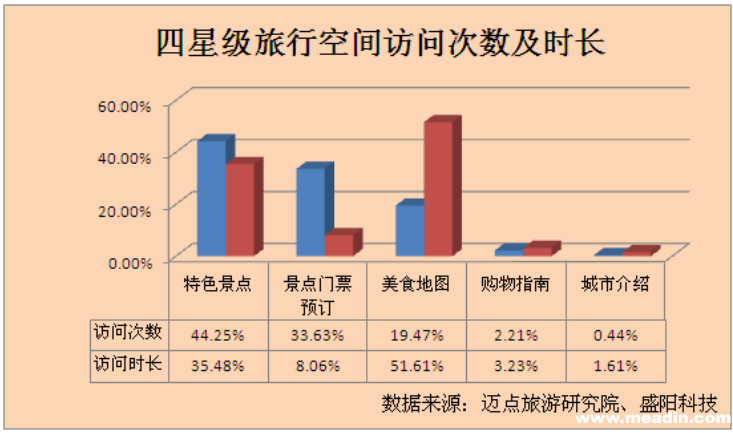 从访问时长上来看,美食地图以51.61%排名第一,特色景点和景点门票预订分居二、三位。