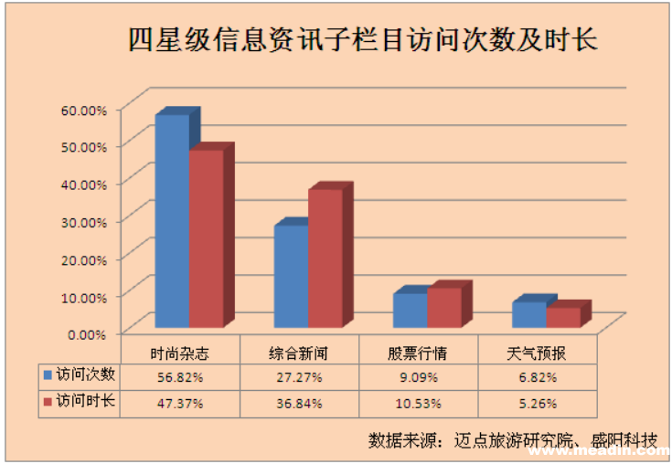从信息资讯上来看,时尚杂志访问次数最高,其次依次是综合新闻、股票行情和天气预报。从访问时长上来看,时尚杂志仍然高居第一,综合新闻占比第二,股票行情和天气预报分列三、四位。