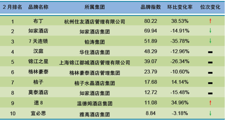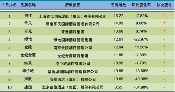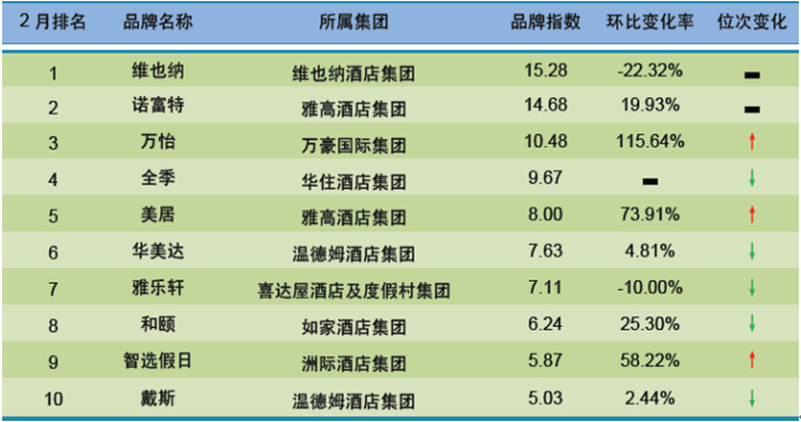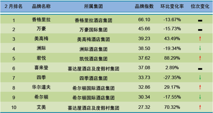 本月有78个品牌的品牌指数环比实现增长,占品牌总数的47.56%。从占比来看,2月指数环比实现增长的酒店以国际品牌最多。