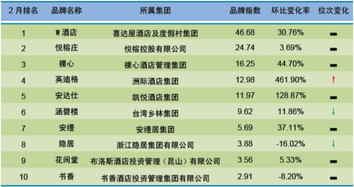 本月监测的164个酒店品牌中,有78个品牌的品牌指数环比实现增长,占品牌总数的47.56%。上升的品牌中,国际品牌24个,占比30.77%;国内品牌15个,占比19.23%;经济型品牌11个,占比14.10%;中档品牌12个,占比15.38%;精品品牌16个,占比20.51%。从占比上来看,所监测的各类酒店中,2月指数环比实现增长的酒店以国际品牌最多。