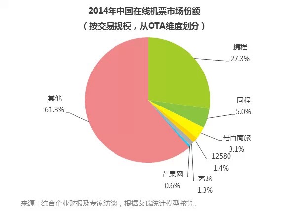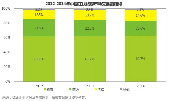 根据艾瑞监测数据,2014年在线机票市场占比达62.7%,比2013年增长1个百分点;度假占比达14.6%,占比持续上升。