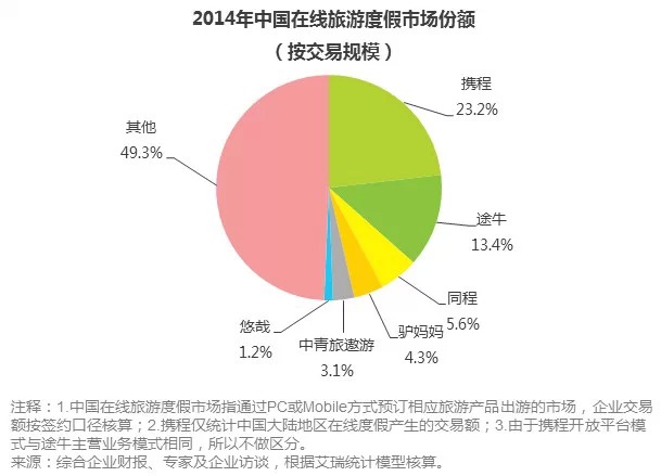 根据艾瑞监测数据,2014年中国在线旅游市场交易规模达3077.9亿元,同比增长38.9%;在线渗透率达9.2%,较上一年增长1.7个百分点。