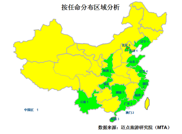 据迈点旅游研究院(MTA)统计数据显示,本月全国共有14个省份和地区的酒店业发生人事变动,其中任命最频繁的是北京地区,共任命了6位高管,占任命总数的18.75%;其次是江苏和福建地区,均任命了4位高管,占任命总数的12.5%;海南地区任命了3名高管,占总数的9.38%。另外,分别有2名高管被任命的地区是浙江、陕西、山东和澳门;广东、湖南、辽宁、重庆、云南和天津也均有1名高管被任命。此外,4月还有1个中国区的集团高管被任命。