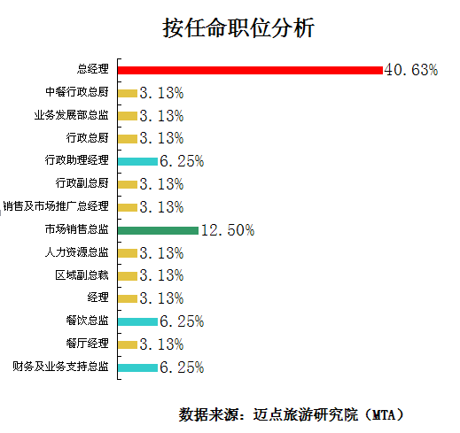 从人事任命的具体职位来看,本月仍然是总经理一职任命人数最多,达到13个,占全部任命数的40.63%。紧随其后的是市场销售总监,总共有4个。行政助理经理、餐饮总监、财务及业务支持总监职位则分别有2位新任命高管。另外,中国区域副总裁、餐厅经理、酒店经理、人力资源总监、销售及市场推广总经理、行政副总厨、行政总厨、中餐行政总厨、业务发展部总监这些职位也分别有1位酒店人被任命。