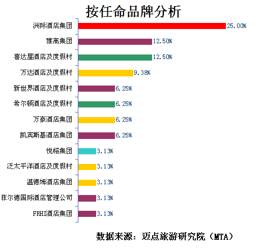 数据显示,在纳入监测的所有酒店品牌中,4月发生高层人事变更的酒店品牌绝大多数都为国际品牌。具体来看,洲际酒店集团任命酒店高管人数最多,共有8位,占全部任命数的25.00%。本月喜达屋以及雅高表现也很抢眼,均任命了4位高管,分别占比为12.5%。万达酒店集团有3位高管被任命,凯宾斯基、万豪、希尔顿以及新世界分别有2名高管被任命。此外,悦榕集团、泛太平洋酒店及度假村、温德姆、菲尔德及FRHI酒店集团分别有1名高管被任命。