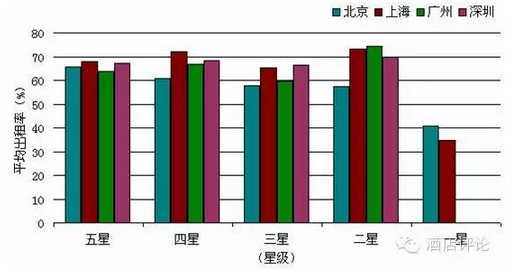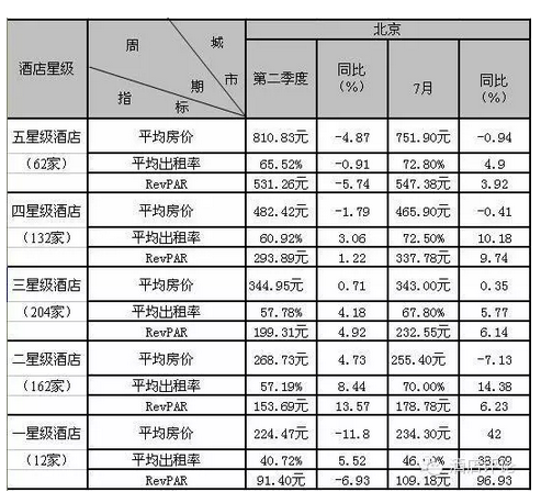 点评:北京2015年7月酒店业经营有向好的趋势,不足之处是以降低房价换取提高出租率,反映了供大于求情况下的价格竞争局面。北京二季度酒店经营数据的最好成绩是2012年。2015年二季度与2012年二季度相比,五星级酒店每间可供房收入下降13.87%,且自2012年以来一路下降;四星级酒店每间可供房收入下降4.32%;三星级酒店每间可供房收入下降3.10%;二星级酒店每间可供房收入上升14.81%;一星级酒店没见可供房收入下降28.39%。