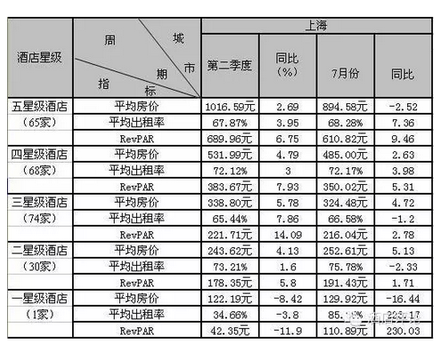 点评:上海酒店经营指标在2013年四季度以前连续30个月同比下降,2013年四季度至2015年7月连续22个月同比上升。上海二季度酒店经营数据的最好成绩是2010年(当年举行中国上海世博会)。2015年二季度与2010年二季度相比,五星级酒店每间可供房收入下降26.50%;四星级酒店每间可供房收入下降3.15%;三星级酒店每间可供房收入下降13.58%;二星级酒店每间可供房收入上升1.48%;一星级酒店每间可供房收入下降60.99%。