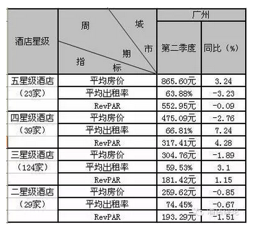点评:广州二季度酒店经营数据的最好成绩是2011年。2015年二季度与2011年二季度相比,五星级酒店每间可供房收入下降18.55%;四星级酒店每间可供房收入下降10.29%;三星级酒店每间可供房收入下降1.58%;二星级酒店每间可供房收入下降1.51%。