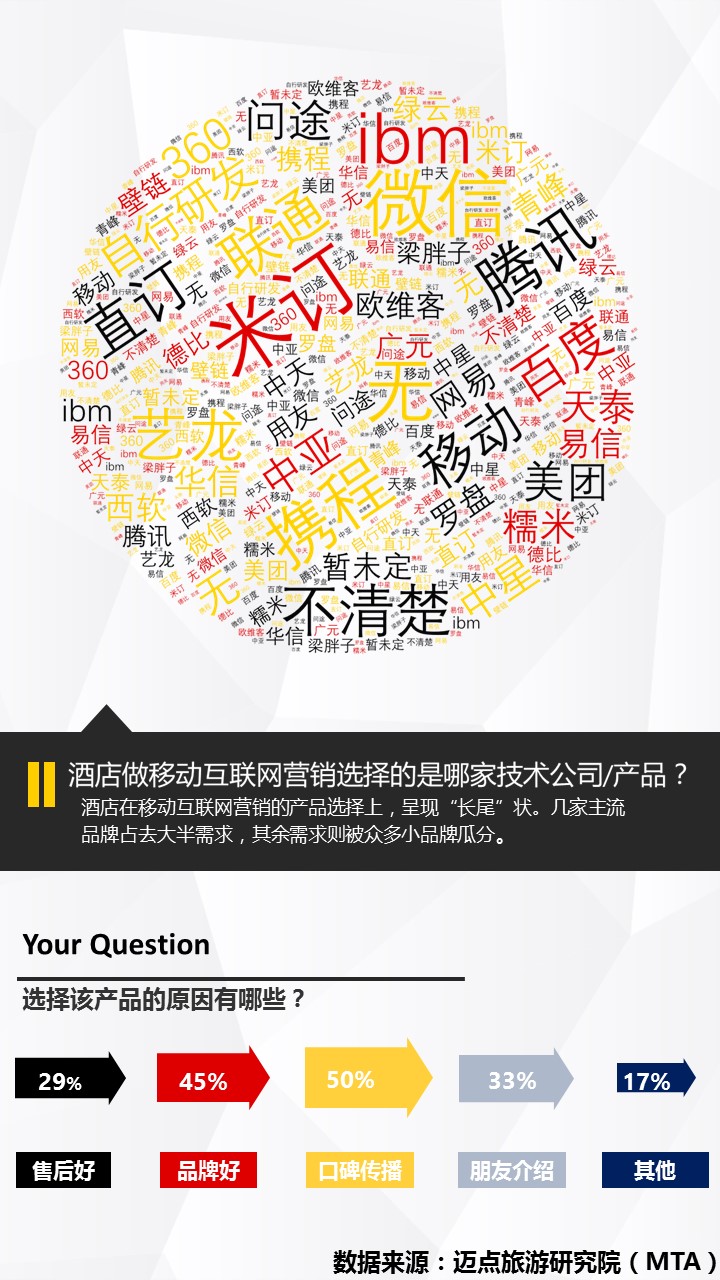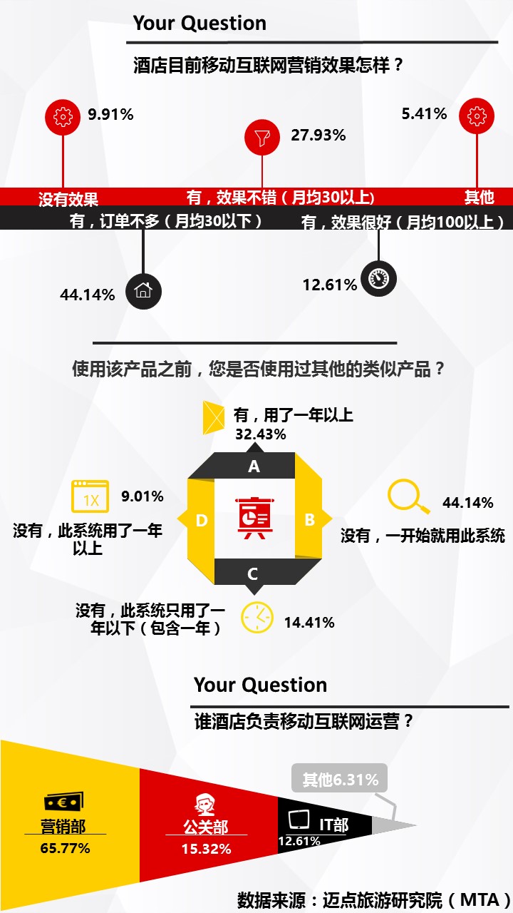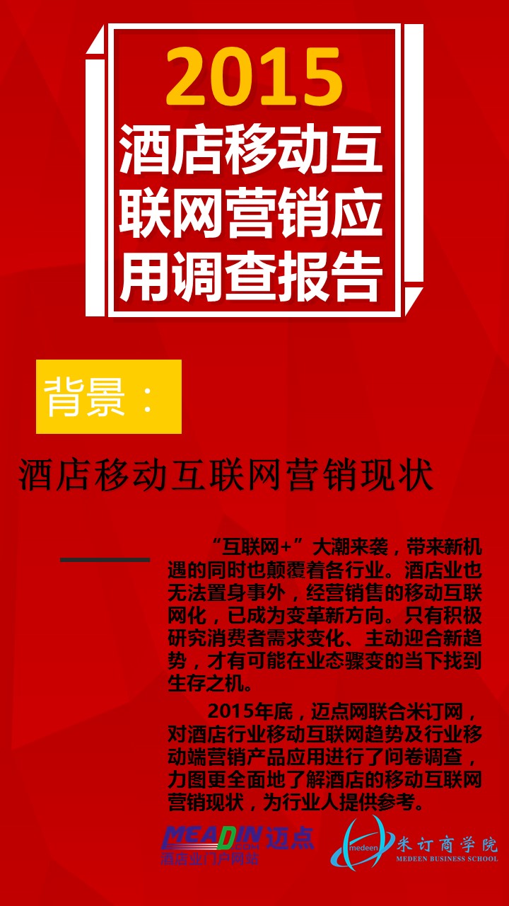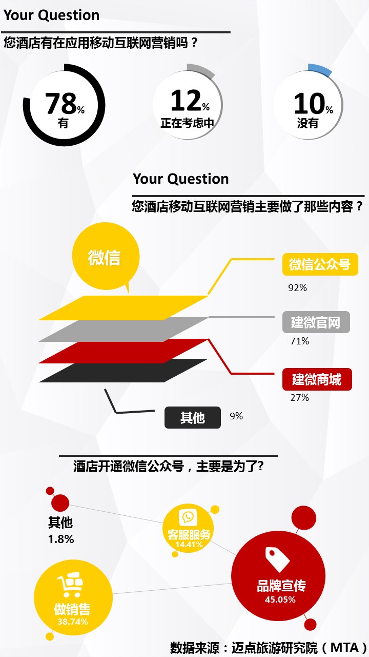 2015年酒店移动互联网营销应用调查报告 迈点网 · 潘铁缘 · 2015-12-21 16:55:45 分享到 打开微信“扫一扫”,打开网页后点击屏幕右上角分享按钮。 调查数据显示,有78%的酒店使用移动互联网营销;12%的酒店正在考虑中;还有10%的酒店没有使用移动互联网营销。 互联网营销 0