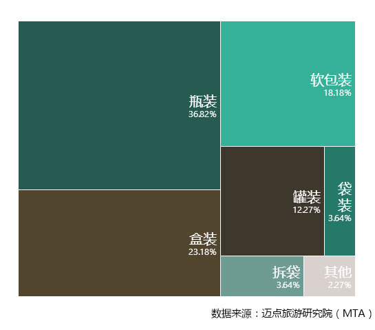 如图3-1所示,消费者在杭州地区2015年3季度高端酒店消费乳制品时,有12.27%的消费者会选择罐装乳制品;有36.82%的消费者则对于瓶装乳制品情有独钟;有18.18%的消费者会选择软包装;而在酒店消费乳制品时选择袋装和拆袋的消费者占比相同,为3.64%;选择盒装的消费者占比也较高,达到23.18%;只有2.27%的消费者在酒店消费乳制品会选择其他形式的包装。