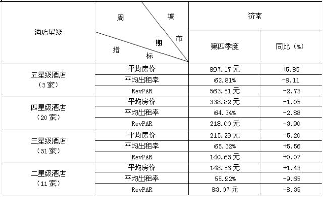 2015年第四季度,全国20个城市中,济南地区五星级酒店平均房价最高,达到897.17元。在出租率上,南京五星级酒店平均出租率最高,达71.73%。