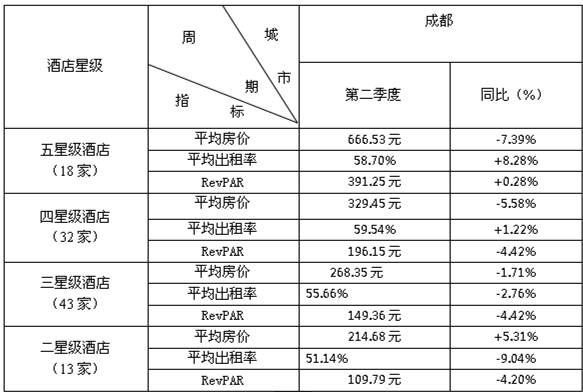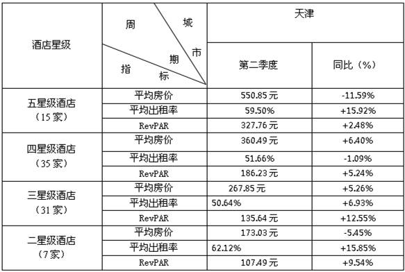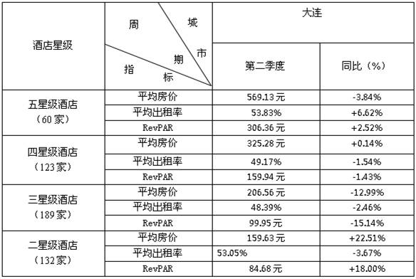 2016年第三季度,全国6个二类城市酒店经营数据中,天津、大连、成都三个城市五星级酒店,每间可供房收入均有不同程度下降。