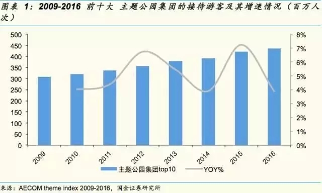 2016年前十大集团接待游客4.37亿人次/+3.9%,增速保持相对稳定:2016年主题公园十大集团商经营相对稳定,增速相较于2015来说有所下滑,接待游客4.37亿人次,增速3.9%。同时前三的主题公园集团排名不变,宋城集团由于考虑到经营规模问题不再计入考察范围。方特、长隆、华侨城集团的增长较快,分别为37%、16%及11.9%,中国的主题公园增长贡献突出。