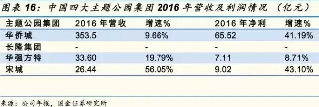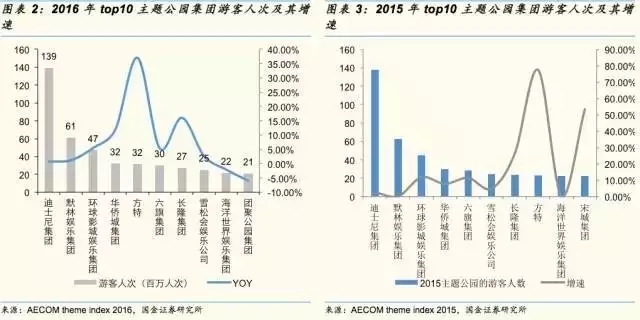 华侨城旗下的东部华侨城、世界之窗、欢乐谷入榜,增速可观:华侨城集团2016年接待游客人次3227人次,增速11.90%,位于全球top10主题公园集团的第四名,排名保持相对稳定。华侨城旗下的主题公园有中国民俗文化村、世界之窗、欢乐谷(6家)以及深圳东部华侨城等,其中东部华侨城2016年接待游客人次396万人次,增速0.5%;世界之窗接待游客人次391万人次,增速13.7%;经营6家(深圳、北京、成都、上海、武汉、天津)欢乐谷,4家(深圳、北京、成都、上海)入榜,4家欢乐谷接待游客人次1263万人次,增速6%。2016年华侨城的出色表现主要归功园区的娱乐设施改造,实现欢乐谷的连锁发展。