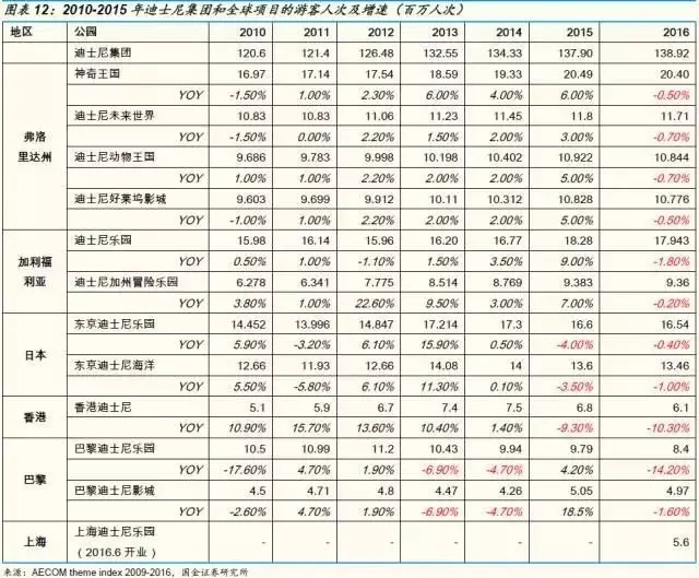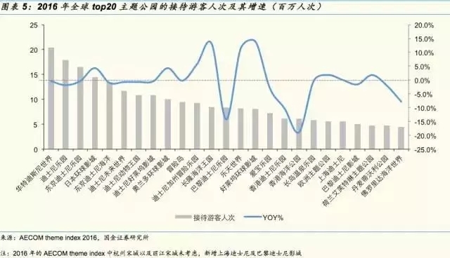 2016年全球Top25的主题公园整体接待游客下滑1.1pct,上海迪士尼经营半年上榜: