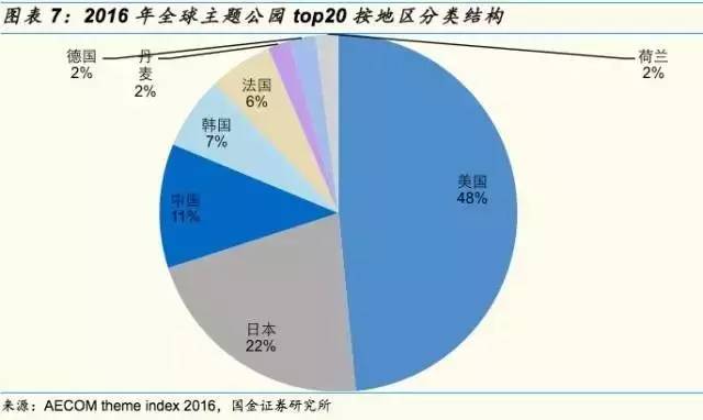 2016年top25主题公园按照地区来分,美国占据大多数,游客人次占比最高:top25主题公园按照地区来分类,10个位于美国,4位于日本、中国4个(内地2个,香港2个)、韩国2个、法国2个,丹麦、德国以及荷兰分别占据1个。美国拥有全球多个大型主题公园,以迪士尼及环球影城为主,10个主题公园共接待游客人次1.13亿人次,增速0.8%,占比全球主题公园top25接待人次的48%。日本4个主题公园共接待游客5035万人次,增速0.8%,占比全球主题公园top25接待人次的22%。中国4个主题公园共接待游客2617万人次,其中长隆海洋王国的增长较快,占比全球主题公园top25接待人次的11%。