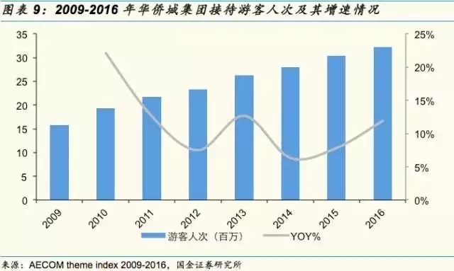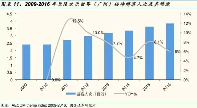 2016年长隆集团接待游客人次2736.2万人次/+16%,位于全球主题公园前十大的第七名:长隆集团旗下共拥有广州长隆旅游度假区与珠海长隆国际海洋度假区两大超大型一站式综合性主题旅游度假区,依托粤港澳的国际性区位竞争优势,长隆集团珠海板块和广州板块联动发展。其中珠海长隆海洋王国接待游客847.4万人次,增速13.2%;广州长隆欢乐世界接待游客383.6万人次,增速为6%。长隆主题公园的高增长主要归因于能够提供优质的游玩体验和娱乐设施。