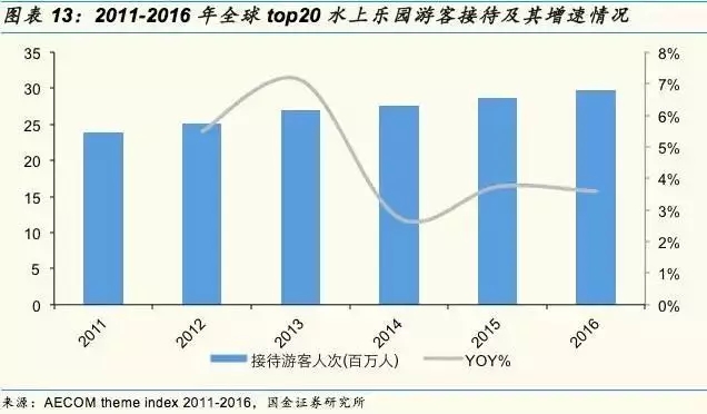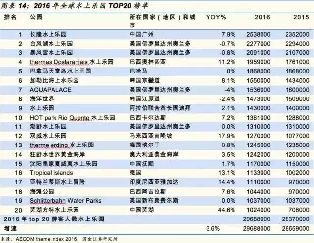 2016年全球top20水上乐园接待游客2968.8万人次/3.6%:2013-2016年全球水上乐园Top20接待游客人次维持正向增长,其中长隆水上乐园是世界上最大规模的水上项目,接待游客253.8万人次,增长7.9%。排名相对稳定,其中top20榜单中美国占有5个席位,5家水上公园项目接待游客人次825.1万人次,下降1.2%。中国上榜3家,包括长隆水上乐园、沈阳皇家夏威夷水上乐园以及芜湖方特水上乐园,3家大型水上乐园共接待游客473.2万人次,增长12.4%,中国的水上乐园仍处在高速发展阶段。
