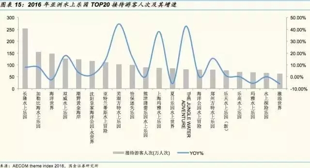 2016年亚洲水上乐园top20接待游客2089.5万人次/5.4%,中国水上乐园依旧强劲:亚洲水上乐园榜单中中国居多,八家水上乐园实现了630万人次,占据了top20榜单的30%,其次韩国三家上榜,实现游客接待470万人次,印尼及马拉西亚分别上榜3家,接待游客270万人次以及300万人次。榜单上中国的大型水上乐园分别为长隆水上乐园(+7.9%)、沈阳皇家夏威夷水上乐园(+1.7%)、芜湖方特水上乐园(+44.6%)、上海玛雅水上乐园(+38.10)、郑州方特水上乐园(+15.6%)、武汉玛雅水上乐园(-5.5%),上海、芜湖及郑州项目增长较快。中国的水上乐园处在快速发展阶段,数量多,规模大,布局广泛,伴随着中国中产阶级的壮大和城市化的发展而快速发展。