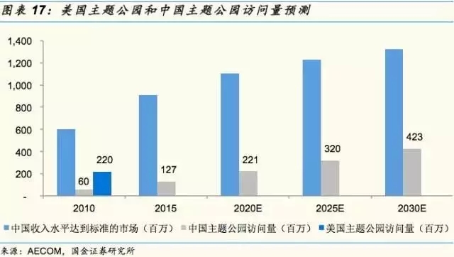 2.中国主题公园客流人次将在五年时间内超过美国:2015年大约有9.09亿中国居民符合参观主题公园的经济准入条件,随着城乡收入的增长,该数据会持续增长。到2020年,达到这一定条件收入的人群数字将是11.04亿。目前中国主题公园市场相对处于初级发展的状态。随着迪士尼和环球影城强势进驻国内市场,消费热情和市场认可将进一步激活,至2020年,中国主题公园人次总量上保持每年11.72%的复合增长率将翻番,并达到2.21亿人,预期达到2010年时的美国水平。