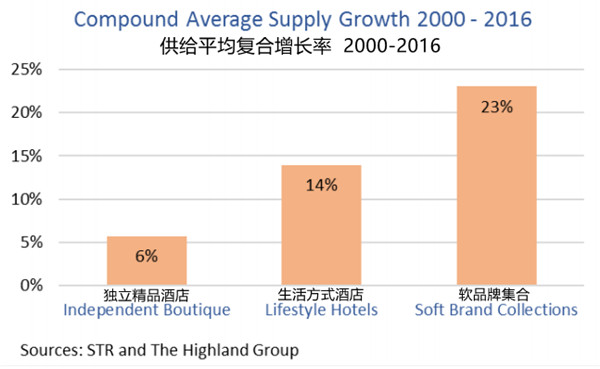 综合被调查酒店数据表现,2000年至2016年供给平均复合增长率最高的是软品牌集合,达23%,其次是生活方式酒店,达14%,独立精品酒店供给平均复合增长率为6%。