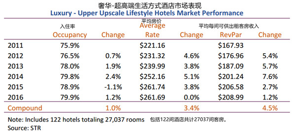 数据显示,2016年奢华-超高端生活方式酒店入住率表现非常强劲,达79.9%,ADR 将近262美元,而2016年全美高档连锁酒店的ADR仅为179美元。
