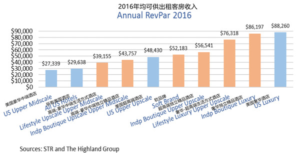2016年奢华-超高端生活方式酒店入住率表现非常强劲,达79.9%,ADR 将近262美元,而2016年全美高档连锁酒店的ADR仅为179美元。