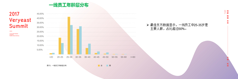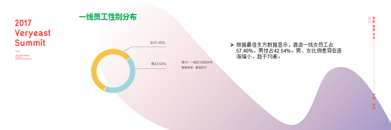 酒店一线岗位男女比例已经逐渐趋于平衡,大专及以下学历占总人数的70%。换言之,旅游服务业从业人员的学习力还有待大幅提升。