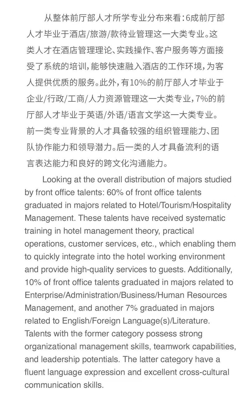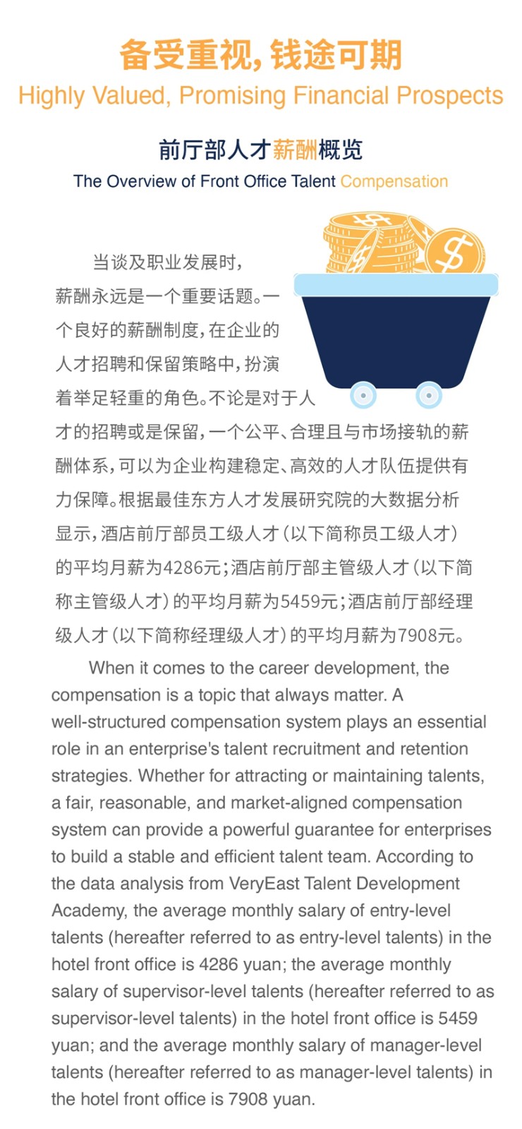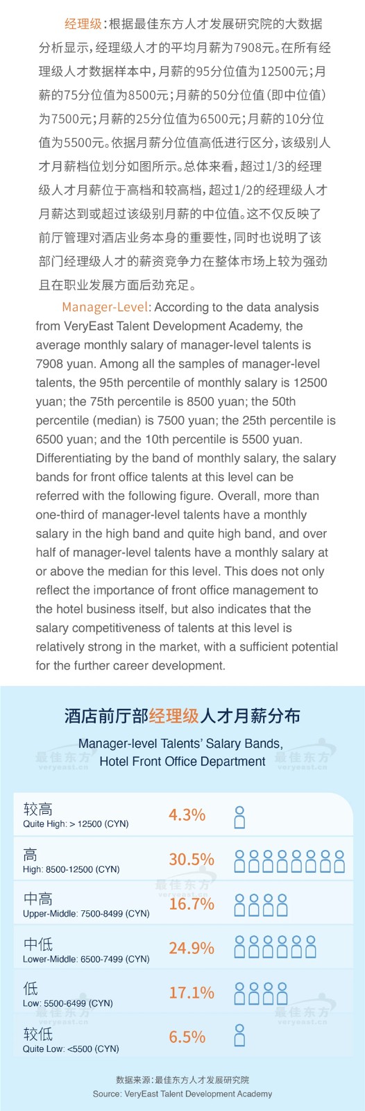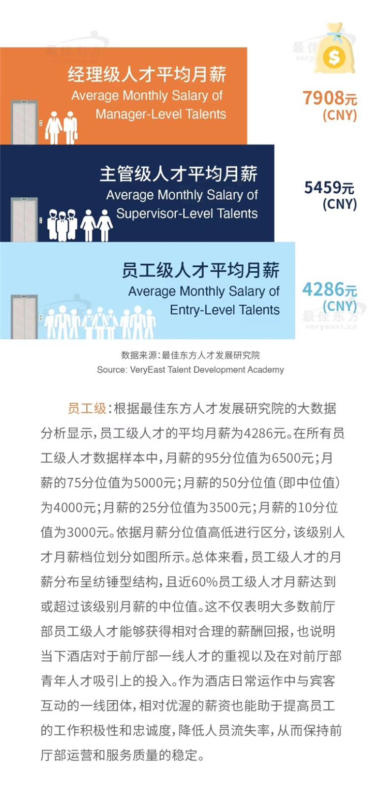 2024年酒店前厅部人才发展专题研究报告 最佳东方 · 2024-03-06 14:59:24 分享到 打开微信“扫一扫”,打开网页后点击屏幕右上角分享按钮。 薪酬分布:经理级7908元/月,主管级5459元/月,员工级4286元/月。 酒店 人才 薪酬报告 2