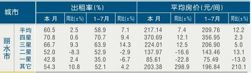 [丽水]11年7月星级饭店平均房价和出租率 迈点网 · · 2011-10-13 08:59:37 分享到 打开微信“扫一扫”,打开网页后点击屏幕右上角分享按钮。 根据浙江省统计局统计数据,11年7月,丽水市星级饭店平均房价为217.14元/间,同比上升7.4%;11年7月,丽水市星级饭店平均出租率为60.5%,同比上升2.5%。 相关阅读:[丽水]11年6月星级饭店平均房价和出租率 [丽水]11年5月星级饭店平均房价和出租率 丽水 店平均房价和出租率 0