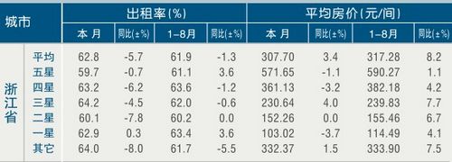 [浙江]11年8月旅游饭店出租率及房价 迈点网 · · 2011-10-15 08:51:12 分享到 打开微信“扫一扫”,打开网页后点击屏幕右上角分享按钮。 根据浙江省旅游局统计数据显示,8月份,浙江省饭店平均客房出租率62.8%,比去年同期下降了5.7%;浙江省平均房价为307.70元/间,比去年同期上升了3.4%。 相关阅读:[浙江]11年7月旅游饭店出租率及房价 [浙江]11年6月旅游饭店出租率及房价 旅游饭店 0