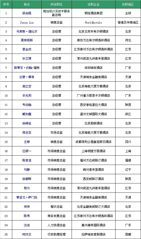 2011年9月,进入迈点网“中国酒店业行业监测系统平台”的5982家星级酒店企业中,共有21家酒店(集团)任命了25位酒店高管,任命人数与上月相同。