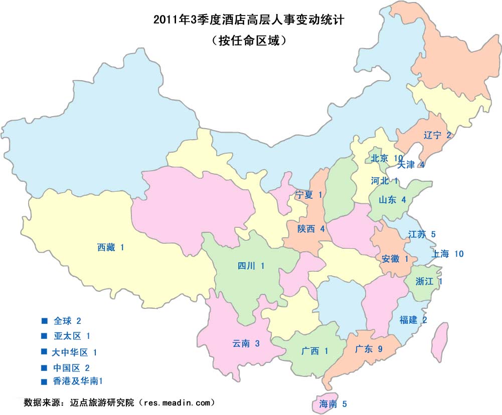 2011年3季度,进入迈点网“中国酒店业行业监测系统平台”的5982家星级酒店企业中,共有57家酒店(集团)任命了72位酒店高管,任命人数比上季度增加了8位,增幅12%。在3季度的任命中,任命频率最高的职位是总经理职位,将近占据任命总人数的50%。任命区域上,值得注意的是本季度出现了一个西藏地区的任命。